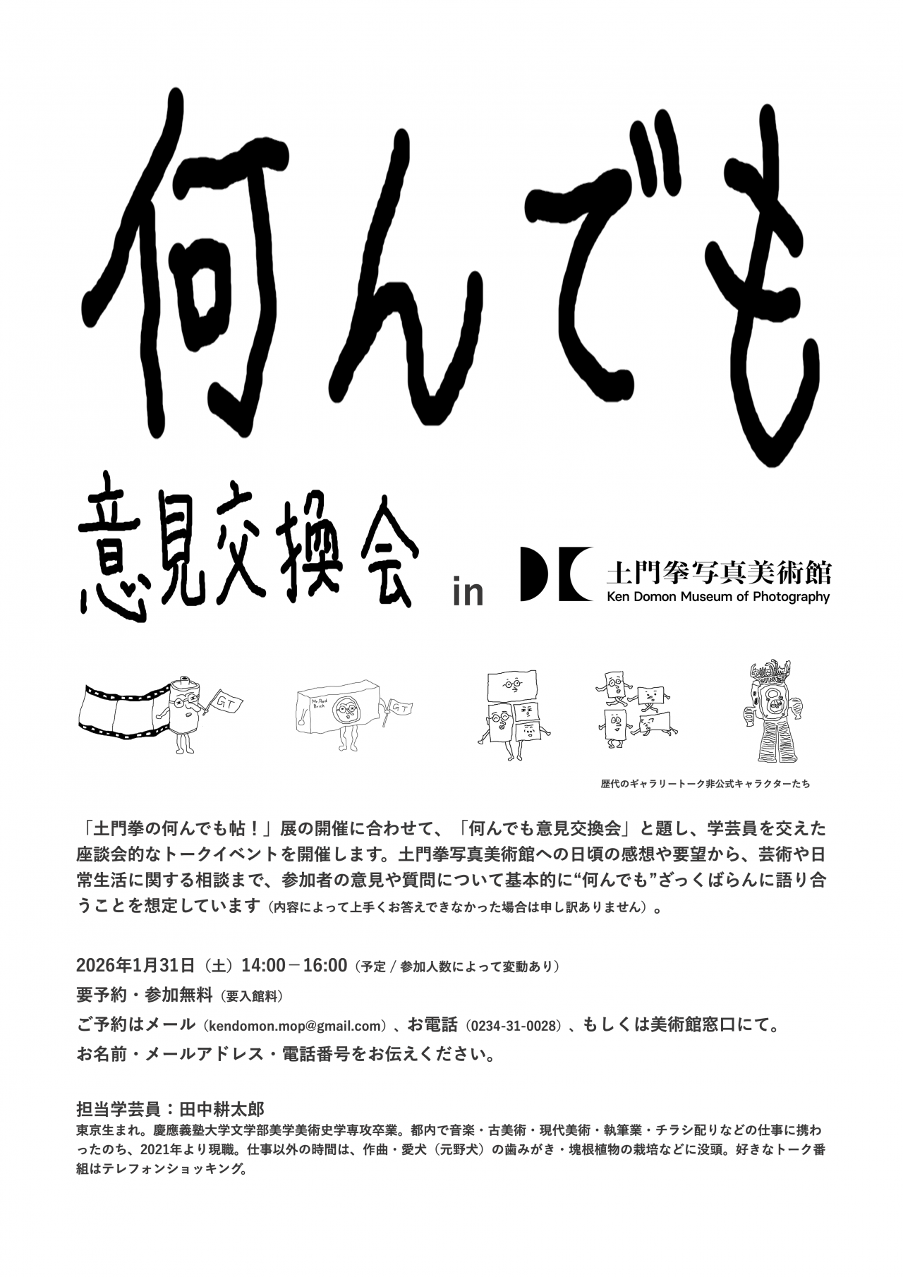 「土門拳の何んでも帖!」展の開催に合わせて、「何んでも意見交換会」と題し、学芸員を交えた座談会的なトークイベントを開催します。土門拳写真美術館への日頃の感想や要望から、芸術や日常生活に関する相談まで、参加者の意見や質問について基本的に“何んでも”ざっくばらんに語り合うことを想定しています(内容によって上手くお答えできなかった場合は申し訳ありません)。