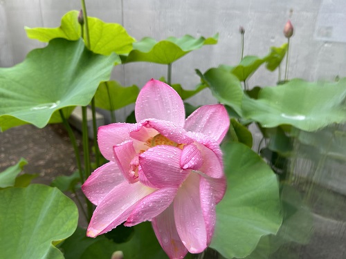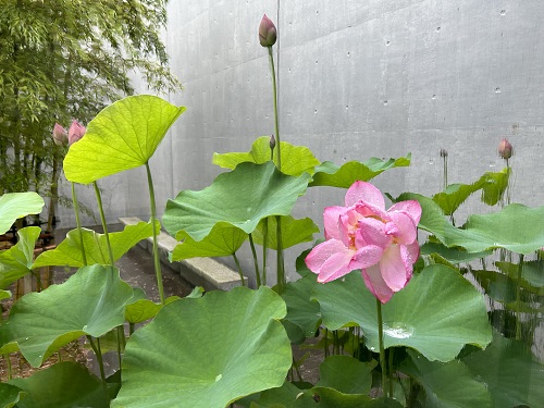 一気に開花したハスも、雨に打たれあっという間に散り始めました。
