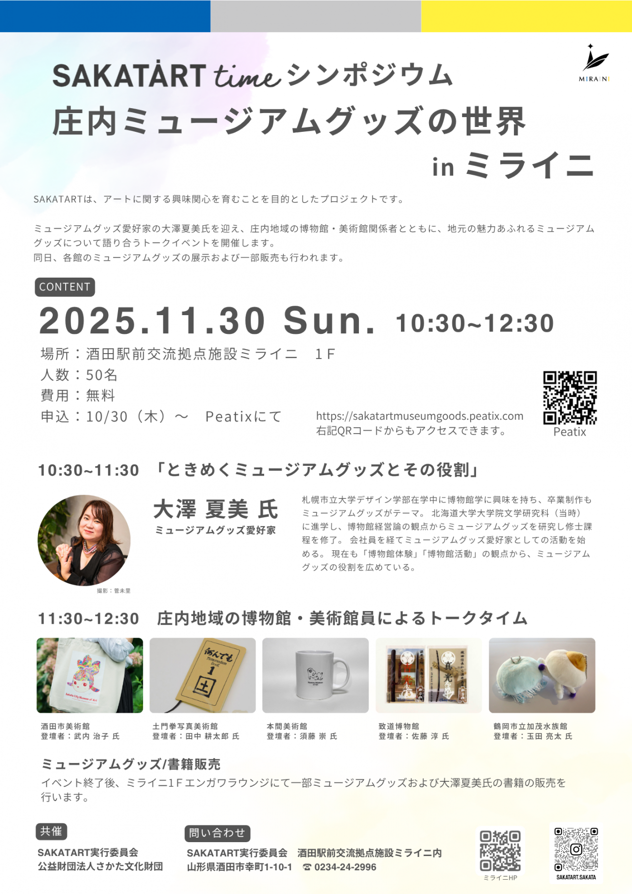 ミュージアムグッズ愛好家の大澤夏美氏を迎え、庄内地域の博物館・美術館関係者とともに、地元の魅力あふれるミュージアムグッズについて語り合うトークイベントを開催します。